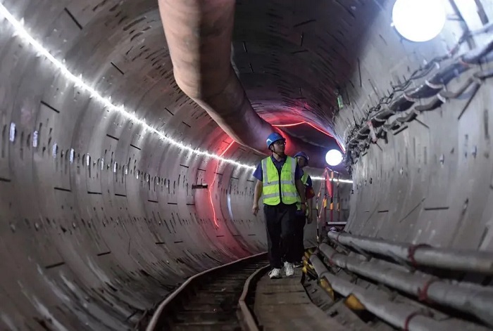 2024年7月30日,由中鐵隧道局承建的天津市濱海新區雨污分流改造工程項目雨水主管隧道順利貫通。圖為工作人員在雨水主管隧道內檢查盾構管片