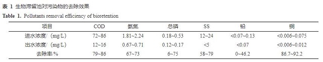 3. 不同雨水工程的污染物去除效果 3.1 生物滯留池 生物滯留池進出水水質與污染物去除率見表1。從表1可以看出,生物滯留池進水水質相當于GB 3838—2002《地表水環境質量標準》劣Ⅴ類,特別是COD較高,為72~86 mg/L,進水水質差主要是由工程匯水范圍內車流量較大引起的。