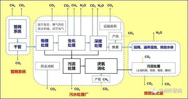 污水處理過程實際就是碳排放的過程,污水處理行業(yè)的碳排放量約占全社會總排放量的1%,在環(huán)保產(chǎn)業(yè)中占比最大。污水處理過程中會排放二氧化碳、甲烷和氧化亞氮。其中,二氧化碳主要來源于污水治理設施的能耗過程,而水污染物降解產(chǎn)生的二氧化碳則認定為生源性碳排放;甲烷主要來源于污水處理厭氧環(huán)節(jié),包括管網(wǎng)、厭氧池、化糞池、污泥厭氧消化池等;氧化亞氮主要來源于污水處理過程的硝化反硝化階段。