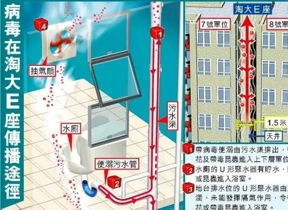 這不得不提起2003年的SARS病毒通過香港下水道系統造成的超級傳播事件。請看下圖↓