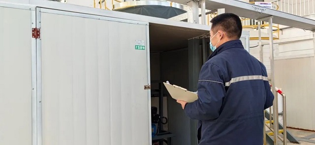 工作人員在記錄消毒設施運行情況