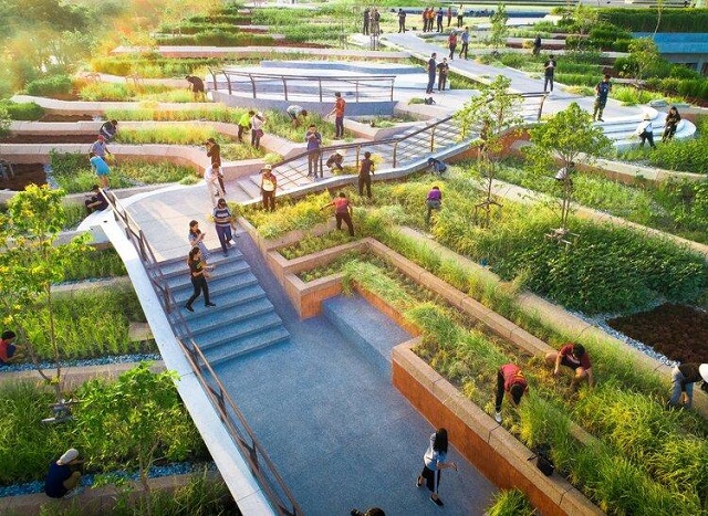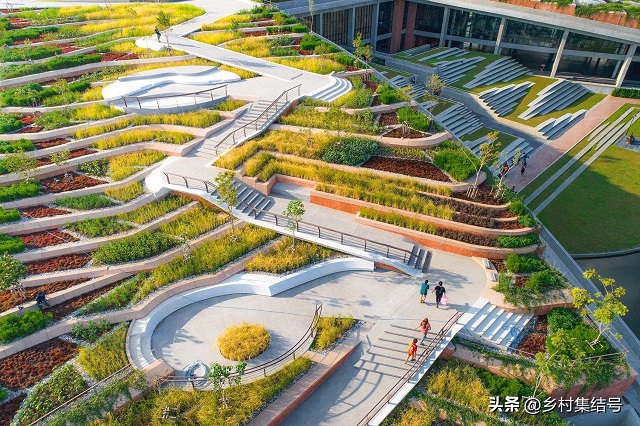 當(dāng)雨水擊中屋頂時,首先農(nóng)作物的種植加強了土壤的肥沃度,減少了雨水期間的水土流失,并有效防止污染徑流和空氣中的毒素從排水系統(tǒng)和自然水體中進(jìn)入。多余的雨水會沿著斜坡蜿蜒而下,下一層梯田就會收集上一層的徑流,所到之處會形成獨特的小分水嶺群,幫助吸收、過濾和凈化雨水。