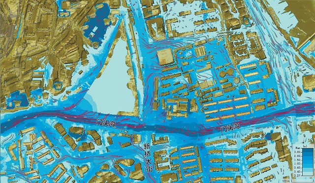 以受災(zāi)較嚴(yán)重的門頭溝和中門寺溝兩個流域為例,8月1日雨勢減小后,工作組即刻到山洪沖擊地區(qū)進(jìn)行現(xiàn)場調(diào)研,收集實地洪水排泄及淹沒資料;8月4日開始搭建洪水反演模擬模型,經(jīng)過近20次的驗證調(diào)試,模擬結(jié)果基本符合實際。經(jīng)過驗證的模型,可以模擬不同降雨條件下洪水和城市內(nèi)澇的淹沒情況,為災(zāi)后恢復(fù)重建、長遠(yuǎn)高質(zhì)量發(fā)展提供決策支持。