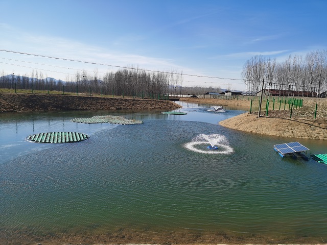 在泗水縣青龍莊村南側(cè),有一處自然坑塘,水體顏色異常且透明度低于20CM,經(jīng)排查確認(rèn)為農(nóng)村黑臭水體。當(dāng)?shù)赝度?6萬(wàn)元,采取排除污水、清除底泥、草皮護(hù)坡、清理坑塘周邊垃圾等措施,治理坑塘面積約4300平方米,汛期可集蓄1.2萬(wàn)余方雨水,為周邊農(nóng)田提供9000余方灌溉水源。此外,還在水面安裝了太陽(yáng)能曝氣機(jī)及生態(tài)浮島,維持水體凈化能力。
