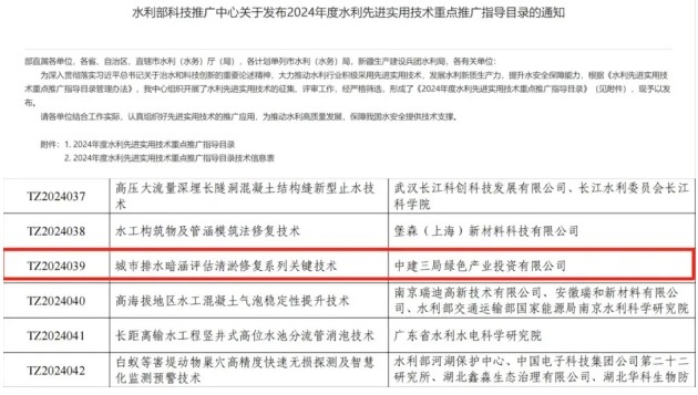 近日,中建三局綠投公司科研成果“城市主干排水暗涵評估清淤修復(fù)關(guān)鍵技術(shù)研究應(yīng)用”成功入選《2024年水利部先進(jìn)技術(shù)重點推廣指導(dǎo)目錄》。該目錄旨在圍繞國家重大戰(zhàn)略實施,和水利高質(zhì)量發(fā)展需求,遴選先進(jìn)、成熟、實用的技術(shù),面向社會公布,推動行業(yè)技術(shù)水平升級提高。