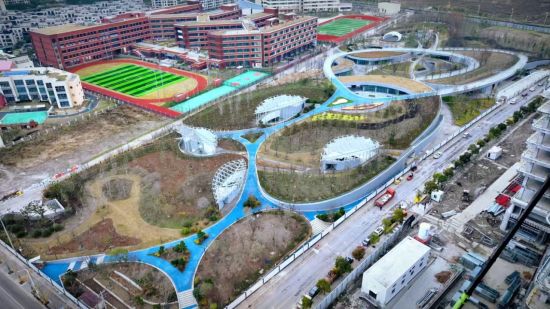 該綠地位于上海臨港滴水湖西側(cè),北鄰洛神花路,南至雪絨花路,東至白荊路,西至云皓路,南側(cè)緊鄰規(guī)劃公交首末站。建設(shè)總用地面積約56109.4平方米,項目以“立體公園、綠色碳匯”為主題進(jìn)行設(shè)計施工。巧妙利用地形起伏構(gòu)建出不同高差道路,并融入周邊多個住宅小區(qū)、寫字樓以及華東師范大學(xué)附屬幼兒園、附屬中學(xué),實現(xiàn)與環(huán)境的生態(tài)共聯(lián),并為周邊各類人群提供了地上地下豎向立體的休憩空間。同時,該綠地大規(guī)模運用環(huán)保材料與精心配置的碳匯植物,打造了綠色屋頂、透水鋪裝、雨水花園等一系列先進(jìn)的海綿設(shè)施,充分發(fā)揮綠地系統(tǒng)“滲、滯、蓄”的功能,從而達(dá)到雨水源頭“凈”的目標(biāo),將景觀功能與生態(tài)功能一體化,在確保排水防澇安全的前提下,最大限度地實現(xiàn)雨水的積存、滲透和凈化,促進(jìn)雨水資源的利用和生態(tài)環(huán)境保護(hù)。
