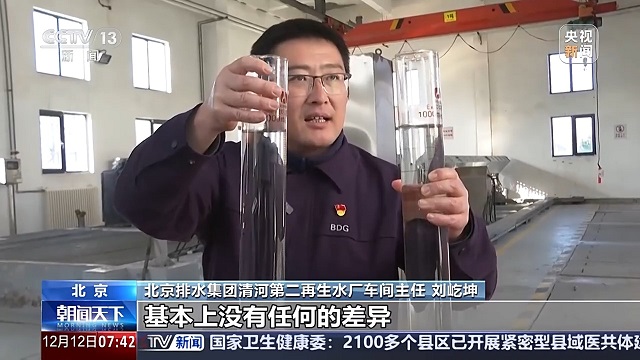 北京排水集團清河第二再生水廠車間主任劉屹坤:再生水和自來水從感官感覺來講,基本上沒有任何差異。同時在這個水里投加了相應的消毒劑,殺死對人體有害的細菌、病毒。